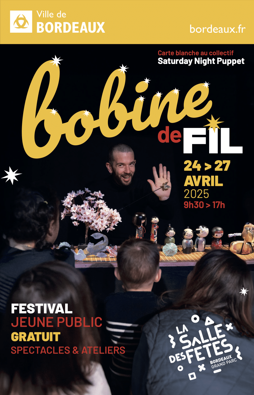 À noter dans vos agendas ! La Salle des Fêtes Bordeaux Grand Parc s’anime du 24 au 27 avril avec le festival jeune public Bobine de fil. Pour sa troisième édition, le festival vous invite à explorer l’univers du théâtre d’objet et des arts de la marionnette à travers des ateliers, des performances et des moments de partage, le tout est GRATUIT. C’est trop bien !