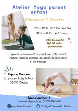 . - Atelier yoga parent enfant, espace Cocoon Cestas. Dim 11 jan, 9h30-11h30. Explorez le mouvement en jouant avec votre enfant grâce à des postures simples (ex: imite des animaux), des comptines, du matériel sensoriel (balles picots, foulards, plumes..) des jeux de respiration et de massage. Sur réservation, 10€.