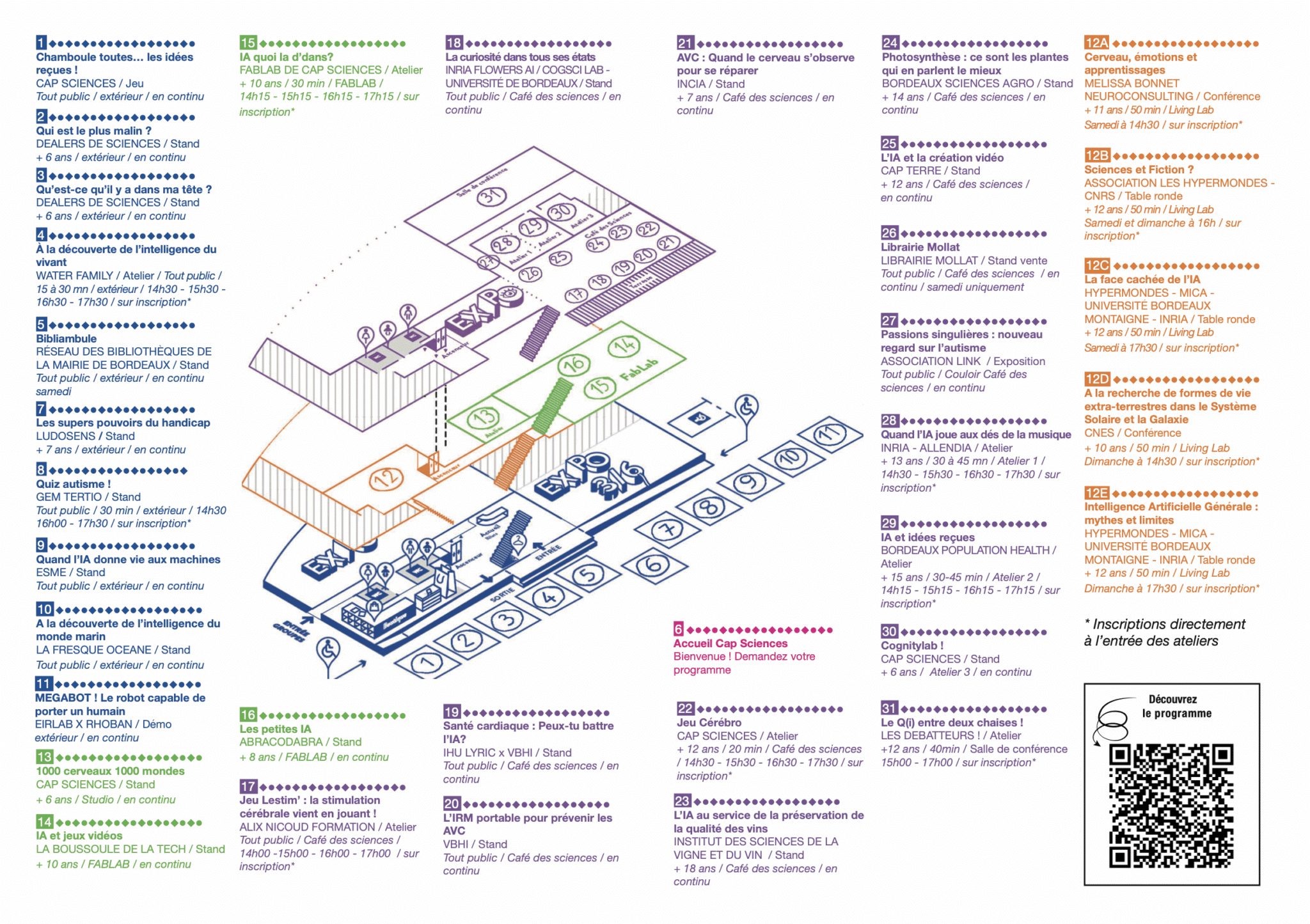 Au détour du Village, vos enfants pourront, par exemple : tester leurs connaissances en s’amusant avec « Chamboule toutes les idées reçues ! » (Cap Sciences), découvrir comment fonctionne l’intelligence artificielle à travers l’atelier « IA quoi la d’dans ? » au FabLab, ou encore s’émerveiller devant MEGABOT, le robot capable de porter un humain !