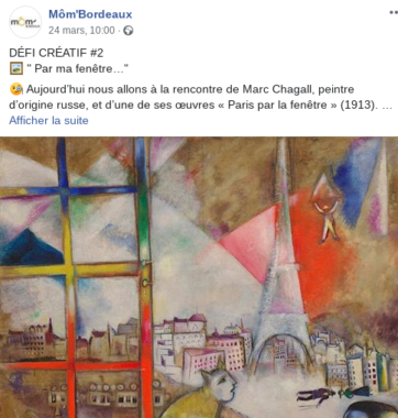 2 fois par semaine (le mardi et le vendredi ) Dorothée de l’équipe Môm Bordeaux, lieu d’accueil artistique et culturel, périscolaire, extrascolaire et familial, partagera sur la page Facebook de Môm Bordeaux 1 activité artistique qui donnera lieu à une expo virtuelle des enfants