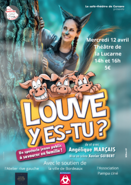 Louve y es-tu ?, Théâtre de la Lucarne à Bordeaux, mer 12 à 14h et à 16h (2 séances). L’histoire revisitée du loup et des 3 petits cochons. C’est trop bien, de 3 à 8 ans. Réservation. 5€
