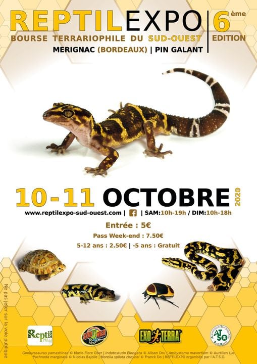 - REPTILEXPO SUD OUEST, Mérignac, sam 10 (10h-19h) et dim 11 (10h-18h), Spécialement pour toute la famille, 6ème édition du REPTILEXPO SUD OUEST, la plus grande exposition / bourse terrariophile du Sud-Ouest. Des dizaines d’exposants venus des 4 coins du monde pour vous faire découvrir des espèces insoupçonnées, 5€/jour, 7,5€ le week-end, Gratuit pour les moins de 5 ans