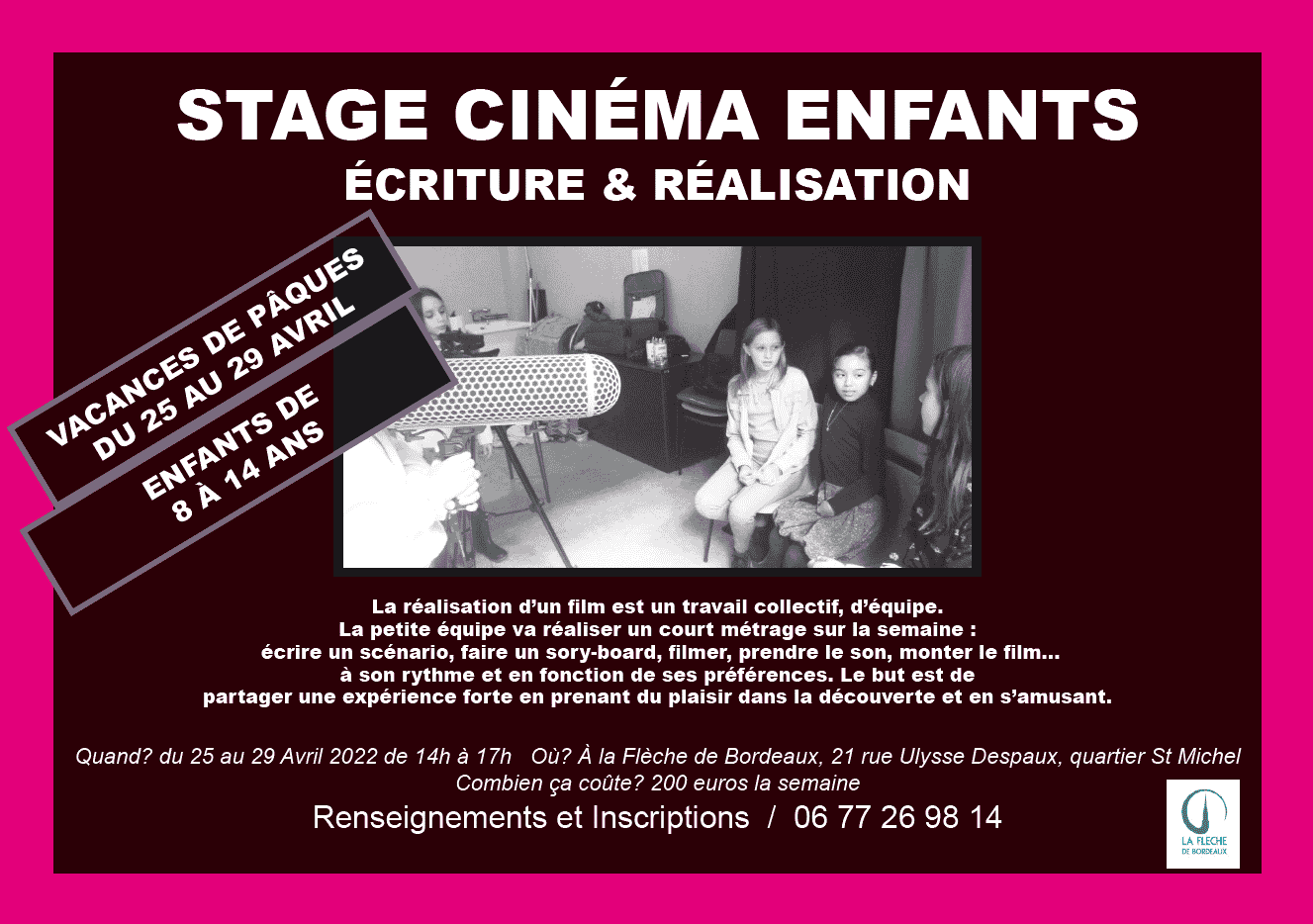Ça tourne ! STAGE CINEMA ENFANTS Vacances d’avril 2022, Pour les 8-14 ans à Bordeaux Réalisation d’un film en équipe de A à Z : scénario, story-board, film, son, montage … Wahou ! Trop bien !