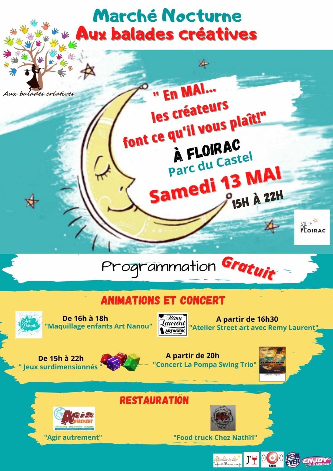- Aux Balades Créatives, en MAI, Parc du Castel Floirac, sam 13 de 15h à 22h. Marché NOCTURNE. Au programme : Animations, Atelier graffeur, Maquillage, Jeux surdimensionnés, groupe « Jazz Manouche » et Restauration sur place.Entrée Libre