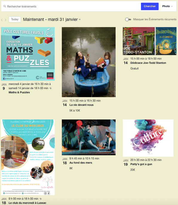 Je rappelle que vous pouvez avoir la vue mensuelle pour une vision d’ensemble ou par liste pour directement avoir le descriptif ou même par visuel(que j’aime beaucoup), il suffit de le sélectionner dans le menu de l’agenda.