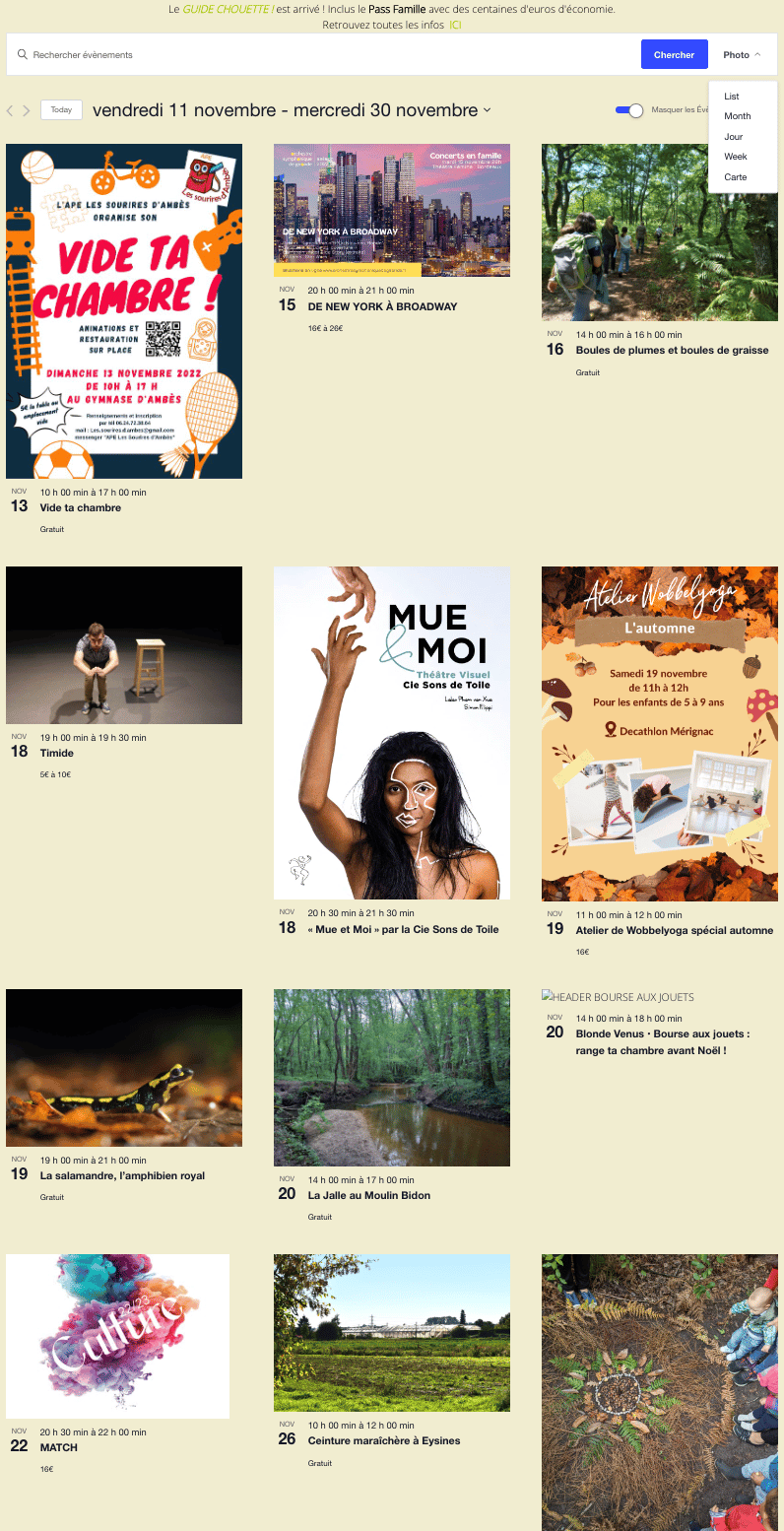Je rappelle que vous pouvez avoir la vue mensuelle pour une vision d’ensemble ou par liste pour directement avoir le descriptif ou même par visuel (que j’aime beaucoup), il suffit de le sélectionner dans le menu de l’agenda.