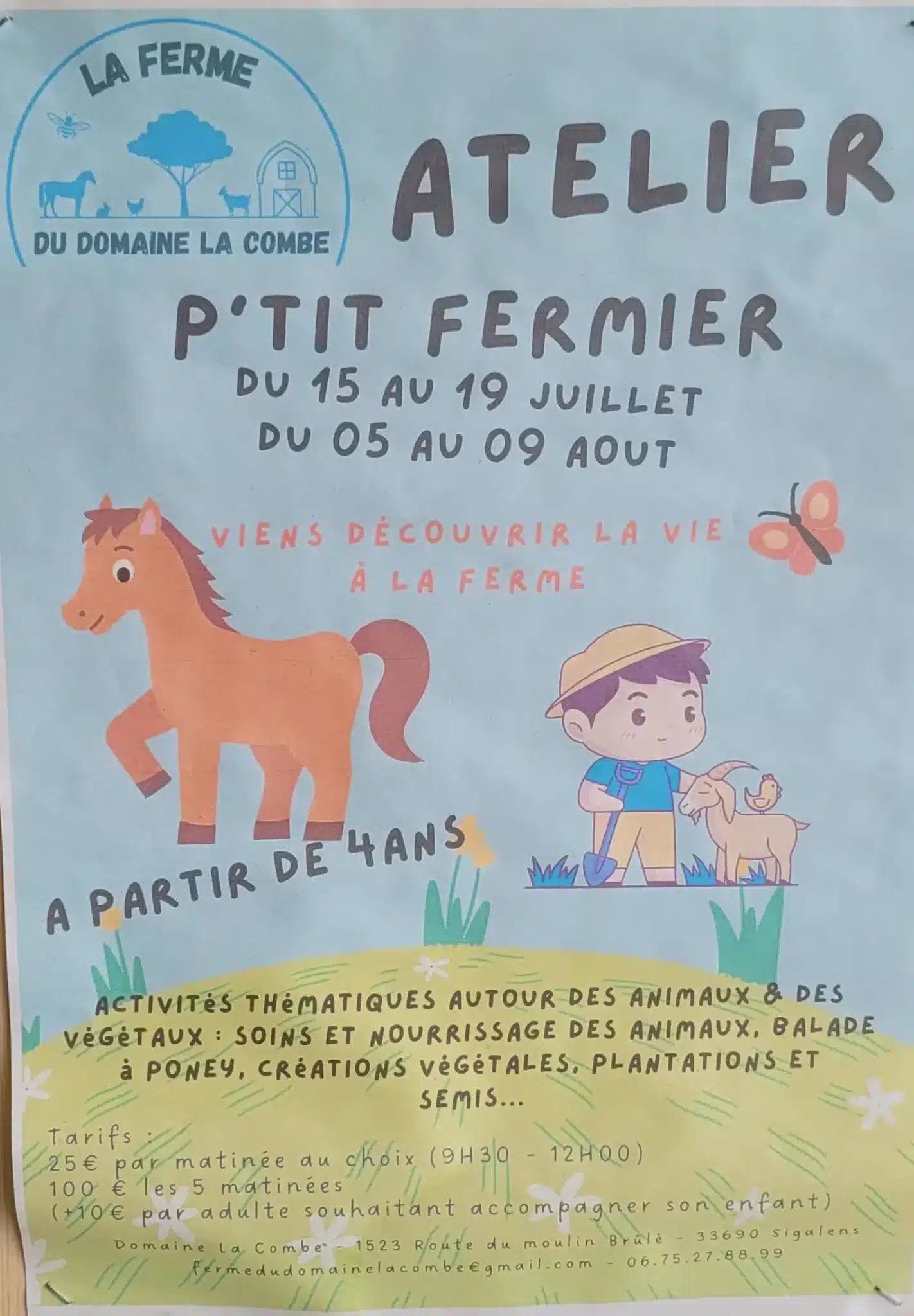 HIIII HHHA. C’est l’Atelier P’tit Fermier au domaine de la combe, une mini ferme proposant des stages à demi-journées en juillet et août, centrés autour des animaux, du potager et du verger.