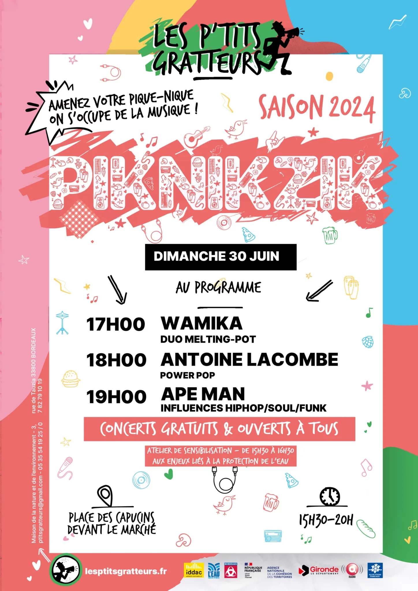 . - Pik Nik Zik #2, Marché des Capucins à Bordeaux, dim 30 de 15h30 à 20h. Les Pik Nik Zik reviennent pour leur 12ème saison de concerts estivaux gratuits, offrant une variété musicale de qualité pour tous. Gratuit