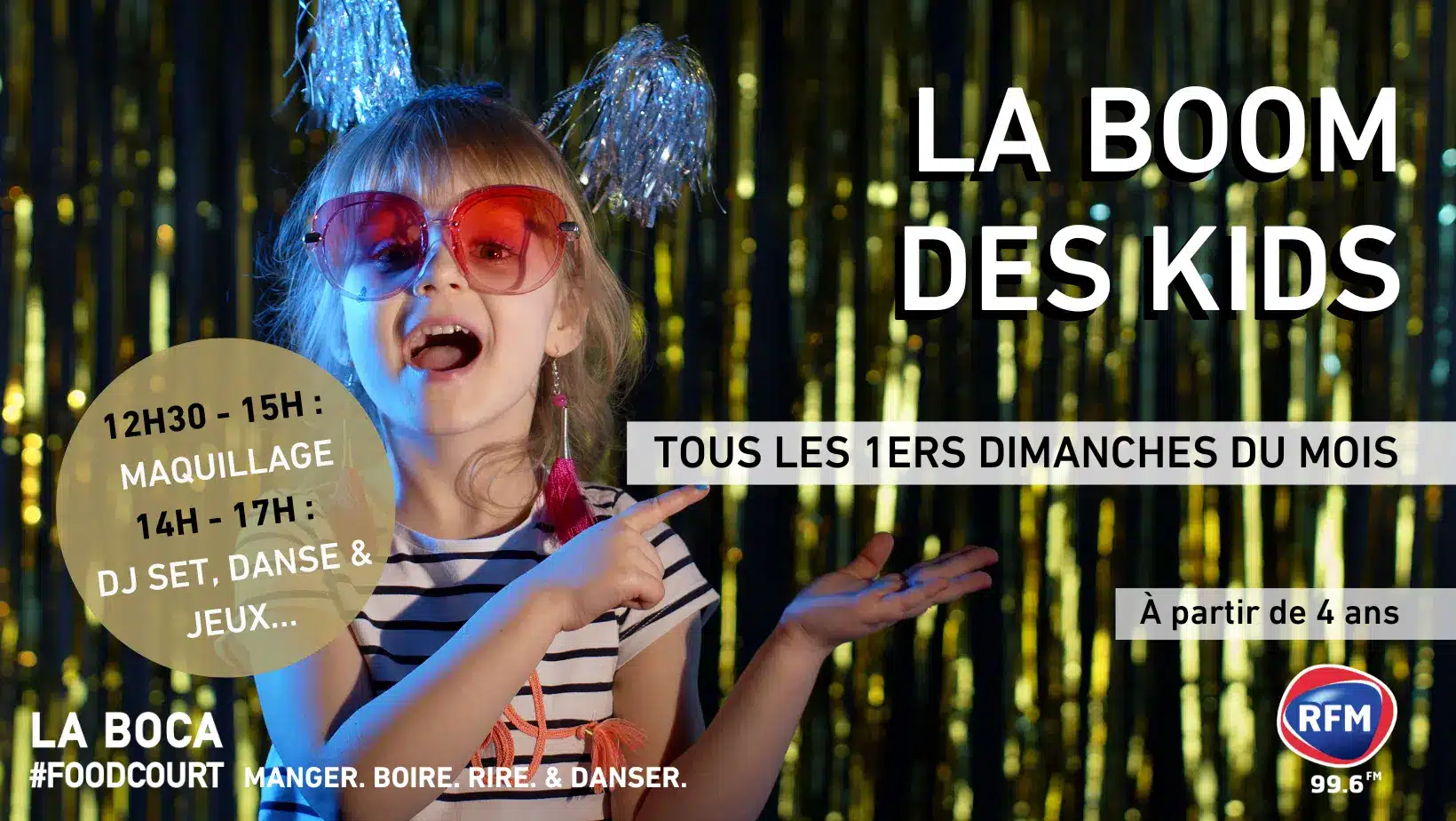 . - La Boom Des Kids, La Boca foodcourt à Bordeaux, dim 7 de 12h30 à 17h. Tous les 1ers dimanches de chaque mois c’est la boom des kids ! Au programme : Stand de maquillage, Boom avec danses, jeux, ballons, bar et des corners food sont ouverts pour les parents ! Gratuit
