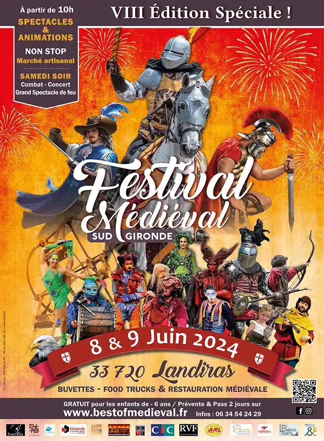 . - 8ème édition Festival Médiéval Sud Gironde (8/9 Juin 2024, 33 720 Landiras), Domaine de Cabiros à Landiras, sam 8 et dim 9. un site exceptionnel de 10 hectares de forêt, au cœur de la nature, avec un grand marché artisanal et des spectacles ainsi que des animations en continu tout le week-end. Gratuit