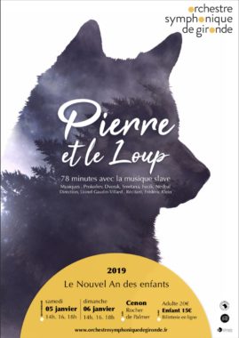 - Pierre et le Loup, Cenon, dimanche à 14h et 16h, L’Orchestre Symphonique de Gironde présente le célèbre conte musical commenté « Pierre et le loup » de Sergei Prokofiev. 20€/adulte – 15€/enfant -10%avec le code papayann10 :-)