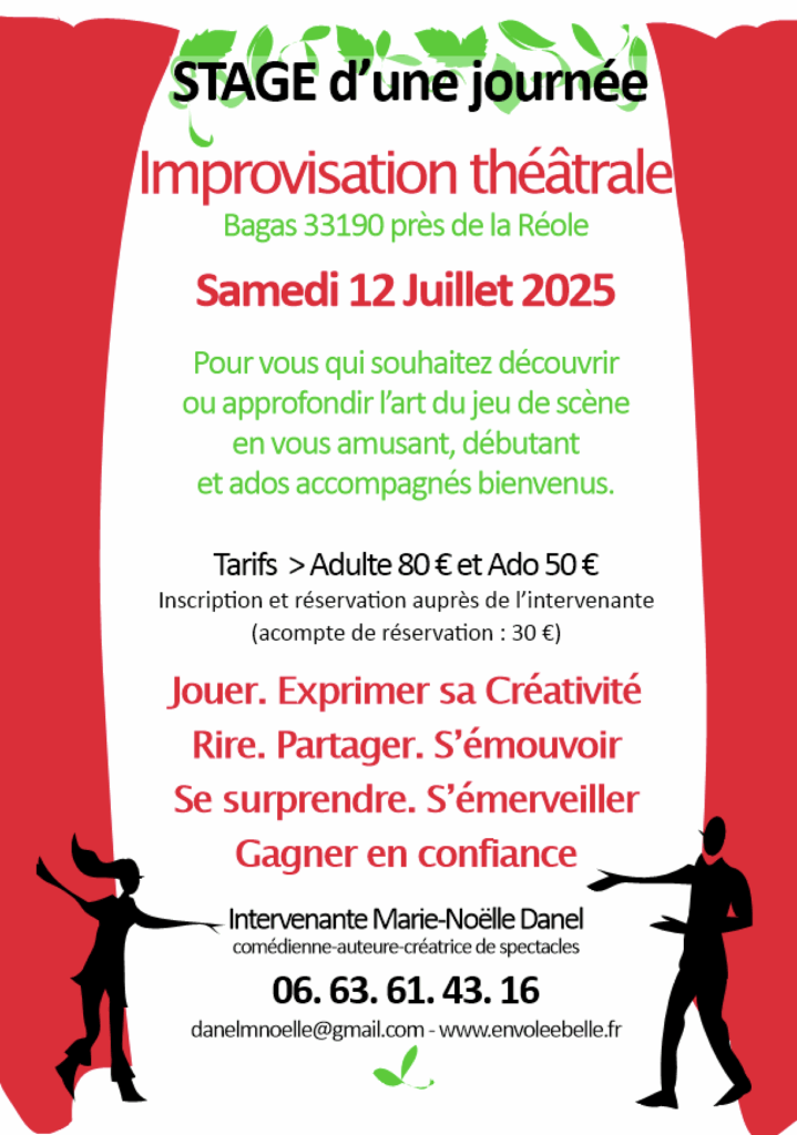 - Parents et Ados – Stage d’improvisation théâtrale, L’Envolée Belle à Bordeaux, sam 12 de 9h30 à 17h30. Un moment complice entre parents et ados autour du jeu de scène, dans une ambiance joyeuse et un cadre naturel propice au bien-être. Réservation De 70€ à 80€.
