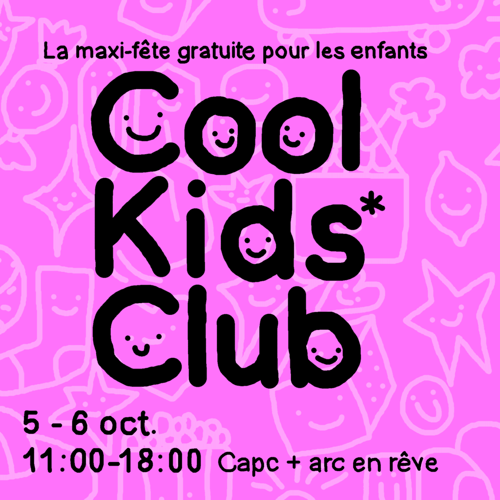 - Cool Kids Club 2024, CAPC à Bordeaux, du sam 5 au dim 6. Le Capc et arc en rêve vous invitent à une grande fête sur deux jours, avec un programme rempli d’activités pour les enfants et leurs familles. Entrée libre et gratuite.