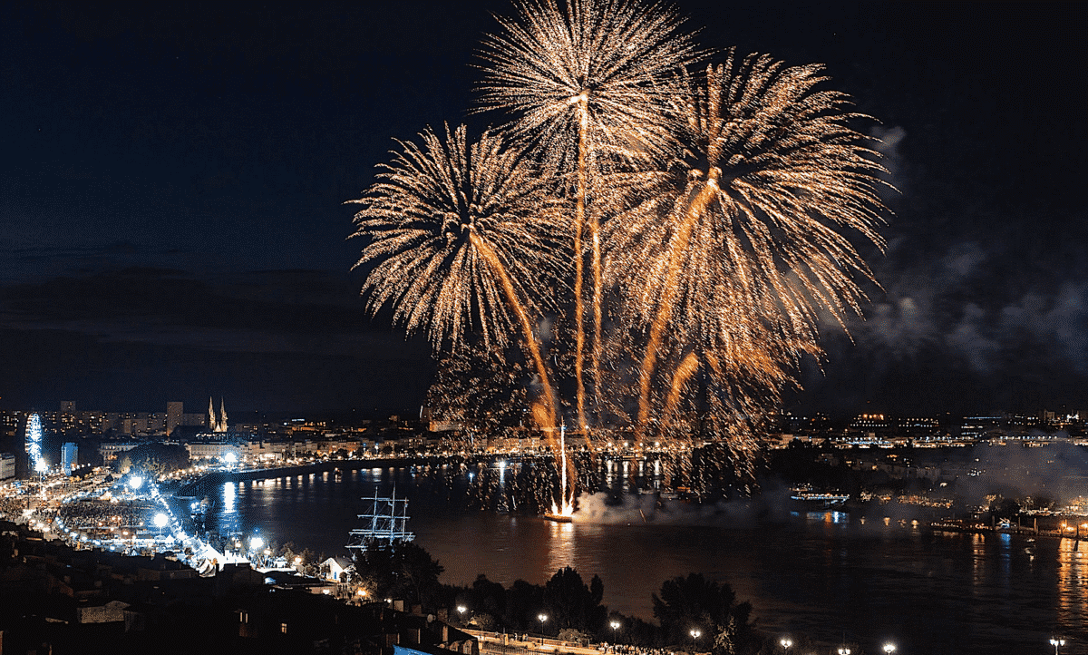 Feu d’artifice tiré depuis une berge sur les eaux, à hauteur des quinconces.