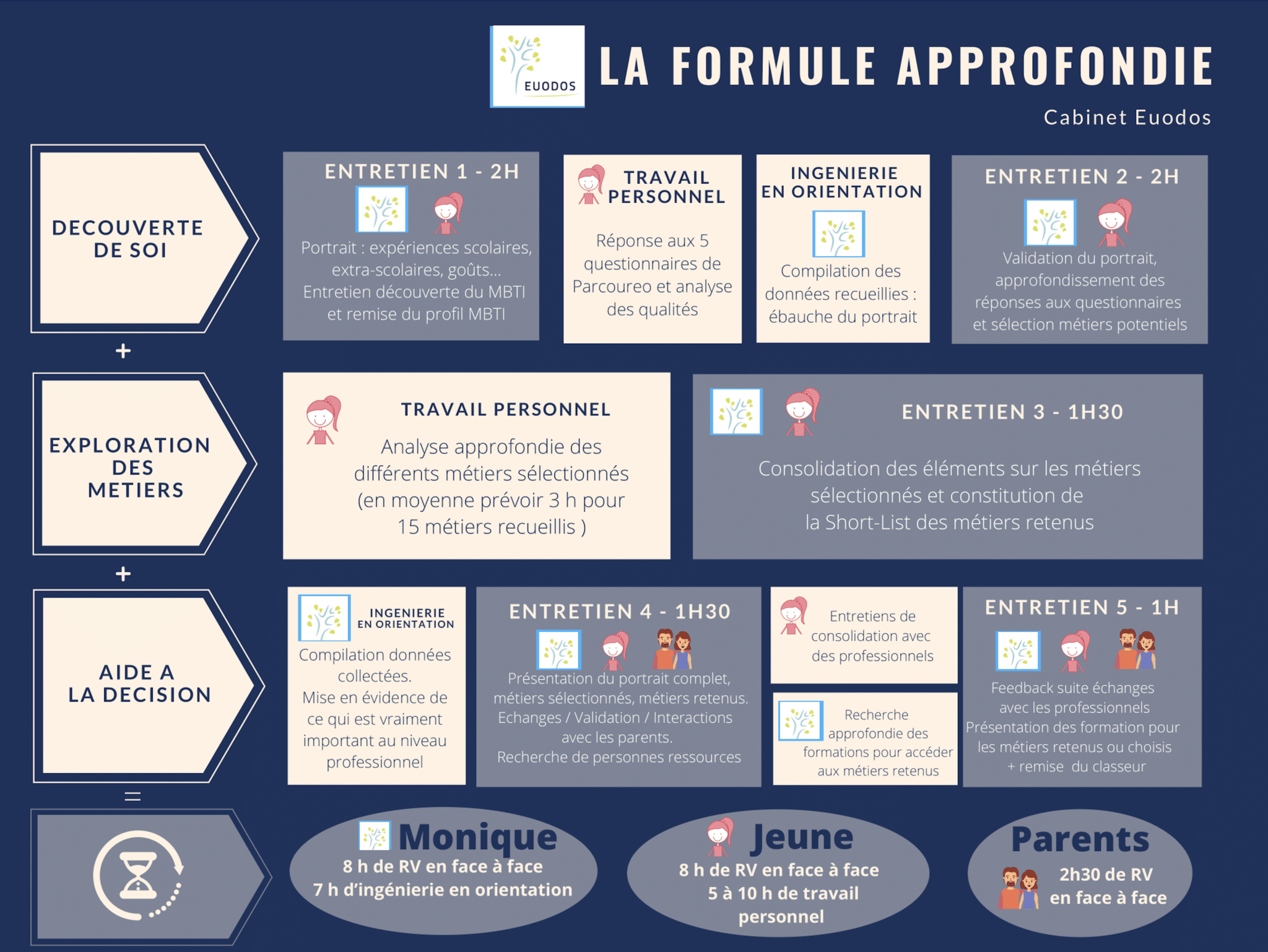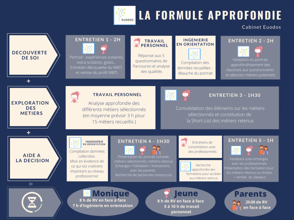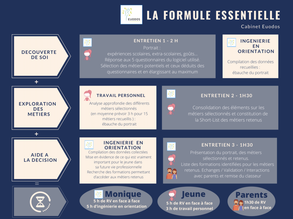 Il faut compter environ 2 mois pour ce parcours. L’enfant (et les parents …) doit murir les différentes options, faire son travail personnel et Monique doit avoir le temps de faire les recherches et de compiler les données. Vous aurez toutes les déclinaisons sur les formations, les métiers, la stratégie des candidatures … un dossier très détaillé de 50 pages.