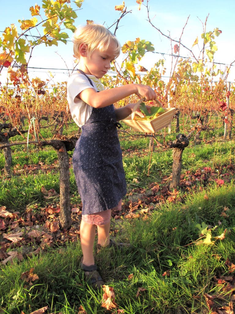 Pendant 1h30 Coraline anime un atelier découverte de la vigne et de la vinification pour les enfants 3-12 ans. Chacun son tablier, son panier de vendange et nous voilà dans les vignes à observer, à récolter raisins, feuilles, branches, terre, cailloux … pour recréer un pied de vigne, placer les différents éléments. C’est presque du ‘Land Art’ !