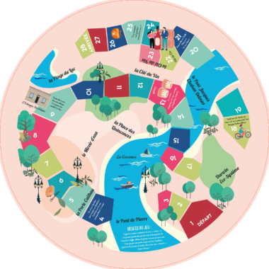 Les amateurs de jeux de société reconnaîtront le jeu de l’oie, mais twisté avec des emblèmes de Bordeaux.