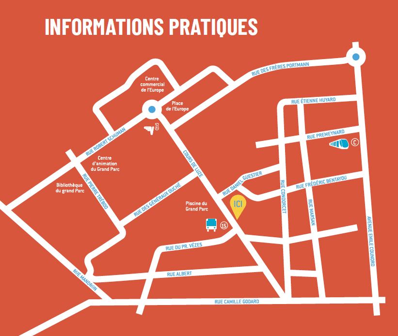 Transport : C Station Émile Counord | 15 Station Piscine Grand Parc V3 | Place de l’Europe