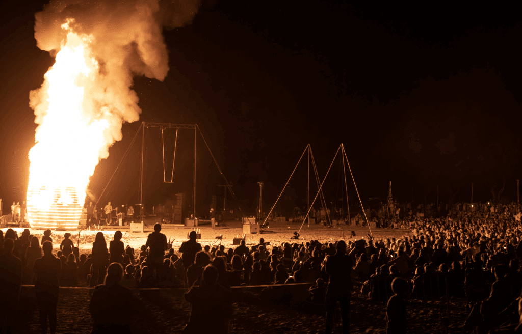 22h45 – Le Feu de la Saint-Jean : «FEU!» par les Compagnies SILEX ! et Rêvolution. Au rythme de la musique et de la danse, les corps entrent en transe, libérant une énergie brute. Entre feu, sable et eau, le bassin devient scène d’une célébration collective et vibrante du jour le plus long. – 35 min