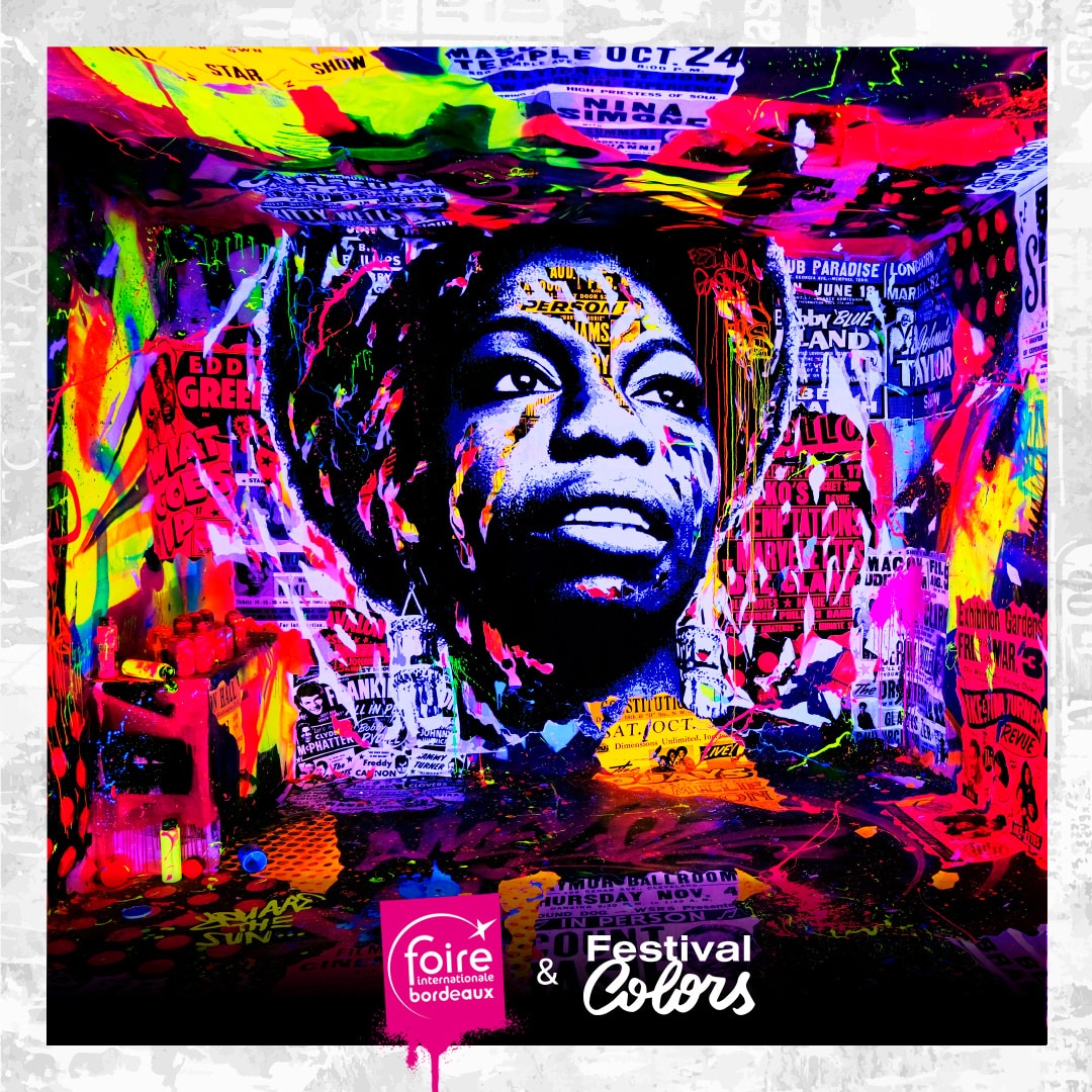 La, vous allez faire WAHOU ! L’exposition Colors Festival, avec au mur, des œuvres XXL aux couleurs fluo… Et des couleurs se révèlent sous les effets des néons. MAGIQUES !