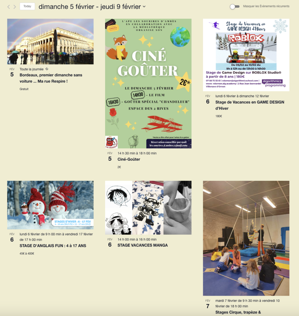 Je rappelle que vous pouvez avoir la vue mensuelle pour une vision d’ensemble ou par liste pour directement avoir le descriptif ou même par visuel(que j’aime beaucoup), il suffit de le sélectionner dans le menu de l’agenda.